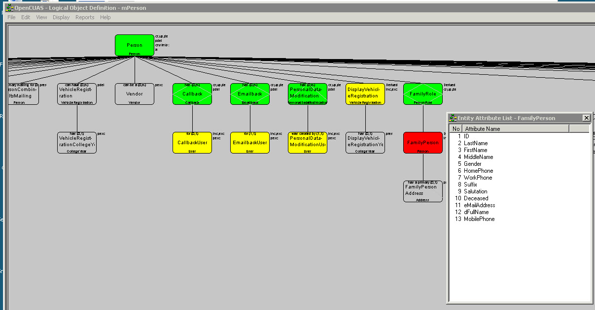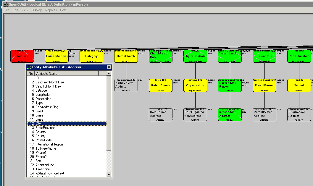 Multiple positions (called “cursor positions”) can be maintained for the same object at run-time, with each group of cursor positions being defined by a View. Thus a reference to mPerson.PrimaryAddress.DateOfBirth identifies a position within the tree structure for an object defined by the view, “mPerson”, a particular entity within the tree named “PrimaryAddress”, and a particular attribute within the entity named “DateOfBirth.” Note that this naming convention requires that a persistent entity appearing more than once in a LOD must have a modified name for at least one of them. Actually, this is common, as the name of an entity in a LOD often specifies its use. Thus, “PrimaryAddress” is used to define to denote that the Address entity in this LOD is the primary address, as opposed to just one of the multiple addresses that a person can have.