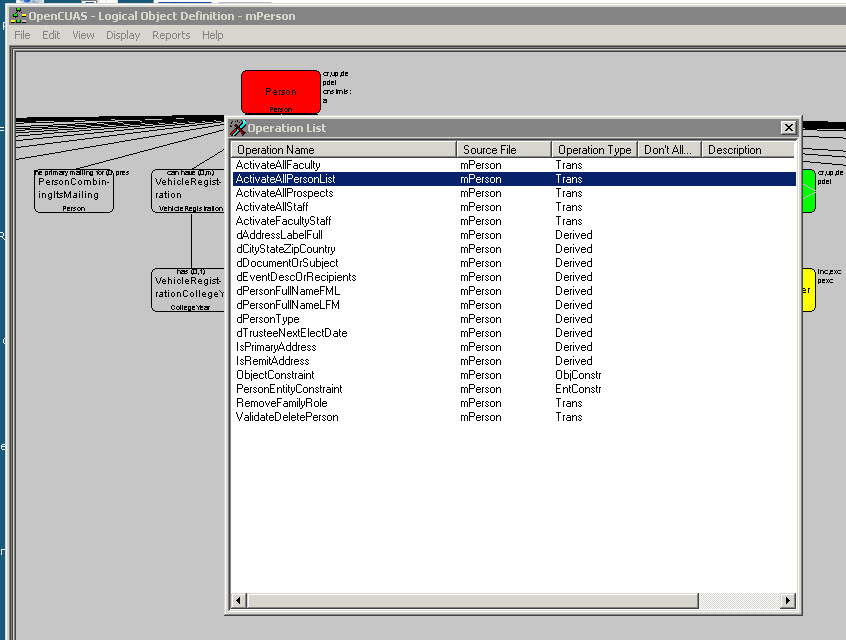Similar to objects in other languages, LODs have methods or operations. However, unlike OOP, those operations are primarily organized into three groups, Transformations, Object Constraints and Derived Attributes, described below. In all cases, the operations are comprised of VML statements defined further in this presentation. The diagram to the right displays the Operations from the mPerson LOD. As is commonly the case, most of the Operations are Derived Attributes, while there are several Transformations, as well as both an Object and an Entity Constraint.