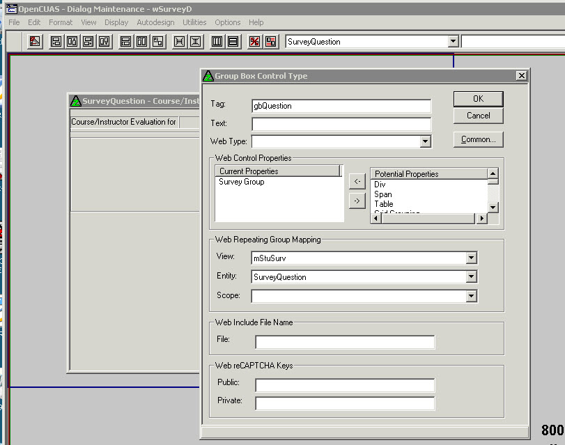 content of the subobject. The results of the web interface are shown in the first diagram above, followed by the mStuSurv object, containing the SurveyQuestion subobject. The final diagram shows the painter interface, with a simple control that looks like a box in the background and the detail for the control in the foreground. Note that the only specifications of the latter are the web control property, “SurveyGroup”, and the view/entity pair, “mStuSurv/SurveyQuestion”, identifying the subobject.