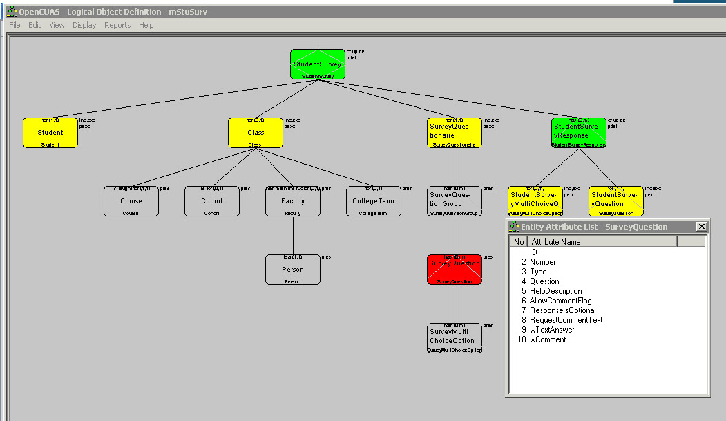 Though there are dozens of examples in OpenCUAS of reusability using single entity inheritance, and several using multiple entity inheritance, it is expected that structural inheritance will see its greatest benefit in supporting reusability through universal design objects in the cloud. One likely reusability option will be in support of complex composite controls working on special subobject structures. An example appears in OpenCUAS in support of a student/class survey interface.