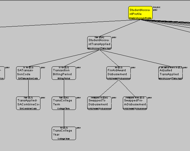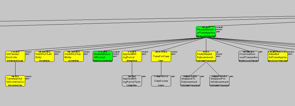 A typical example of a multiple entity inheritance is found in the OpenCUAS operation to generate charges for a student. The rules to generate charges use a fairly complex set of subobject data, including enrollment entries and prior charges. The primary object for this purpose is mSAProf, part of which is displayed to the right. However, there are other situations where those billing rules need to be applied to another object with a similar structure, such as in mSAProfE, part of which is also shown to the right.